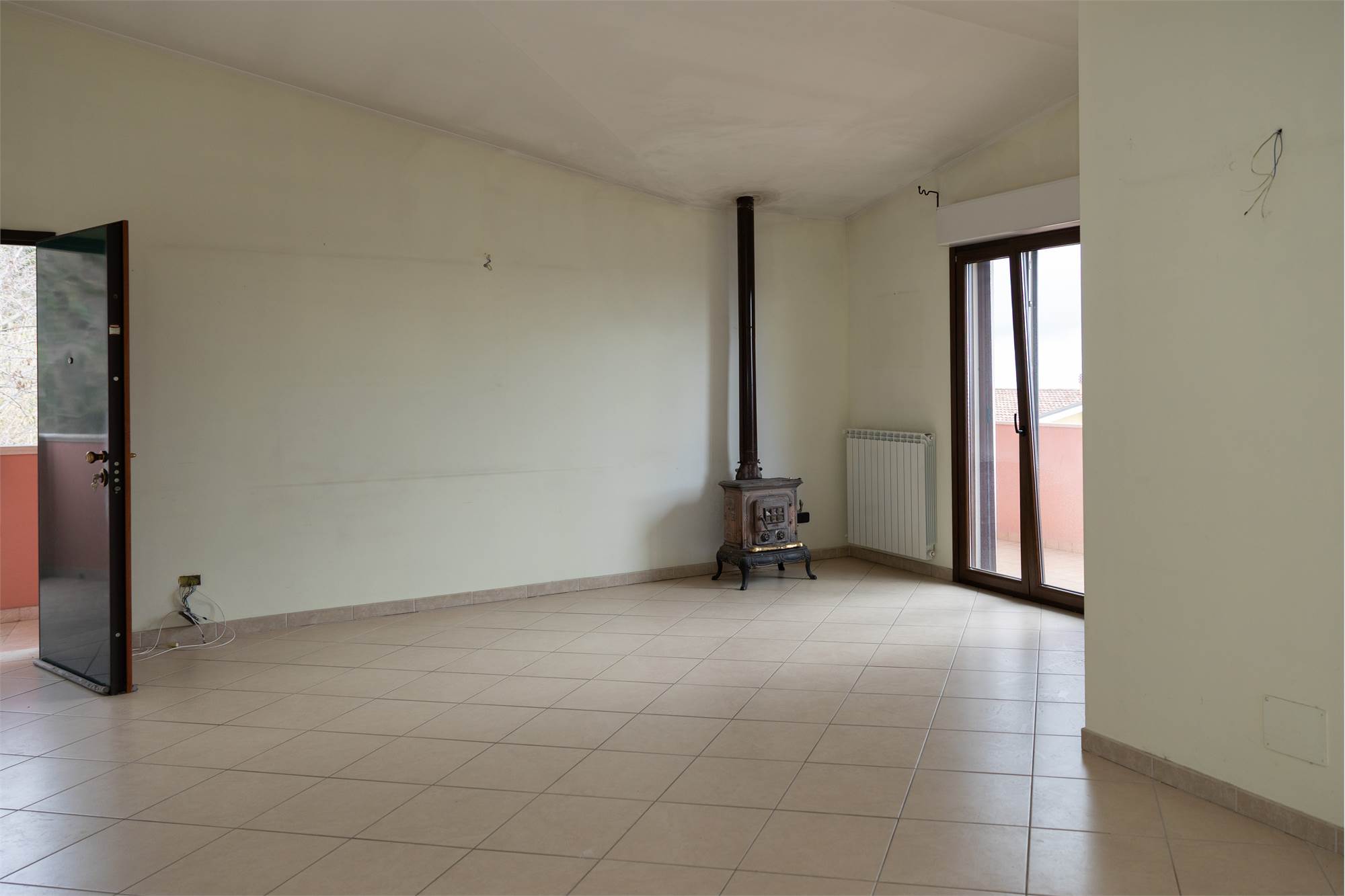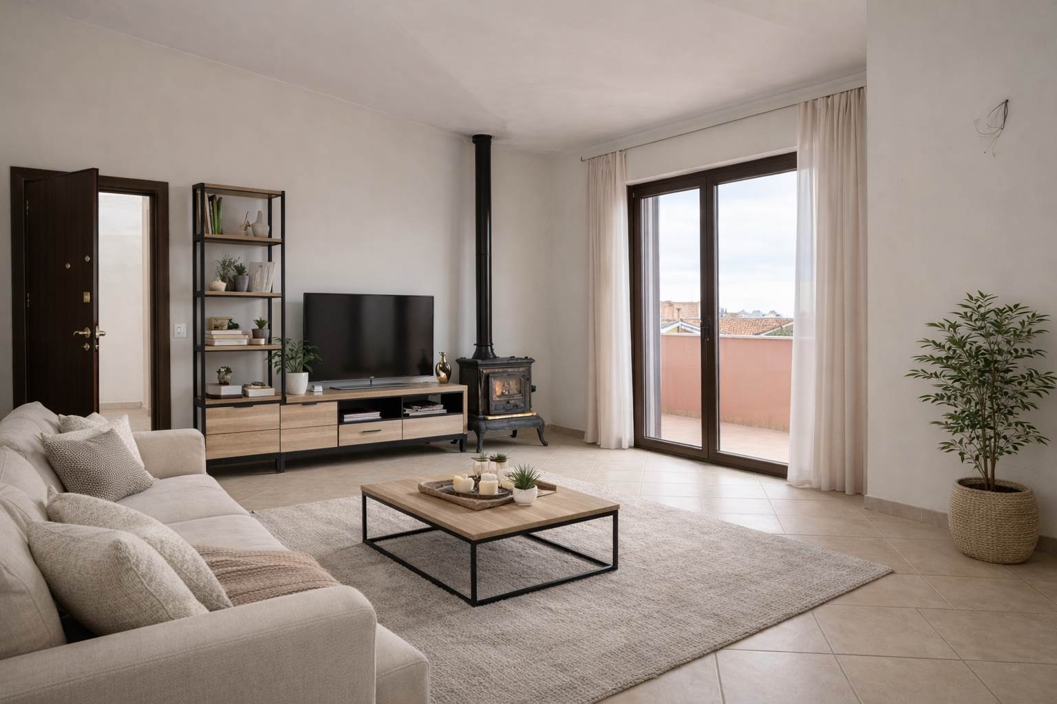 L’appartamento, posto al 2° ed ultimo piano di circa 100 mq, è composto da: soggiorno con angolo cottura, due ampie camere, due bagni, terrazzo e balcone. Completa la proprietà un posto auto e l’impianto con autoclave.